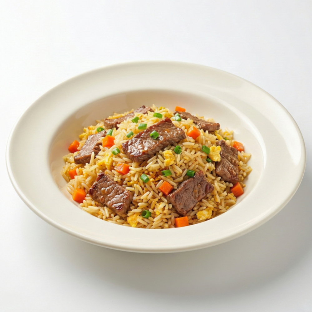 Азиатский рис обжариваем с овощной смесью, имбирем, зеленым луком и тонко нарезанным маринованным филе говядины.